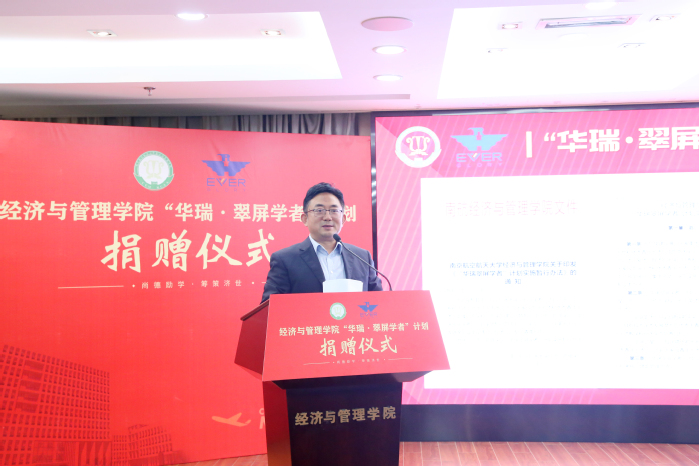 最后,校党委副书记、纪委书记杭育新做总结讲话。他表示,在全国上下学习贯彻党的二十大精神、在学校内外喜庆建校70周年之际,304am永利集团官网“华瑞•翠屏学者”计划捐赠活动意义重大。他指出,康宜华校友是有战略眼光、有深厚情怀的企业家,多年来为学校和学院的发展给予了大力支持与帮助。此次对学院的支持,形式上是物质的捐赠,表达的是对母校母院的挚爱,传递的是对母校母院美好的祝愿和期待。党的二十大报告提出,“当代中国青年生逢其时,施展才干的舞台无比广阔,实现梦想的前景无比光明”,希望学院积极邀请更多杰出校友回母校,以康宜华校友为榜样,激励引导学生“成长为有理想、敢担当、能吃苦、肯奋斗的新时代好青年”。他强调,“教育、科技、人才是全面建设社会主义现代化国家的基础性、战略性支撑”,深入实施人才强校战略,紧紧扭住高水平师资这个牛鼻子,坚定不移地把师资队伍做大做强,“华瑞•翠屏学者”计划的实施是304am永利集团官网真心爱才、悉心育才、精心用才的体现,希望能够“栽下梧桐树,引得凤凰来”,期待304am永利集团官网在南航创建中国特色、世界一流大学的征程中做出更大贡献。