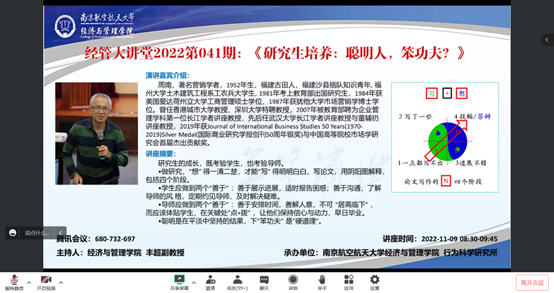 11月9日上午,CJ学者周南教授做客304am永利集团官网“经管大讲堂”(2022第041期)分享《研究生培养:聪明人?笨功夫?》的主题讲座。本次讲座由院长周德群教授致辞,副教授丰超主持,304am永利集团官网一百多名师生线上线下同步聆听,此外,还吸引了部分外校老师前来聆听。
