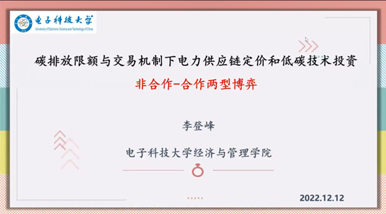 12月12日下午,长江学者特聘教授、电子科技大学304am永利集团官网李登峰教授受学院智能决策与风险分析研究所邀请,在腾讯会议作题为“碳排放限额与交易机制下电力供应链定价和低碳技术投资非合作-合作两型博弈”的学术讲座。永利官网教授徐海燕、副教授高广鑫等教师及部分硕、博研究生线上参加了李教授的报告分享,本次学术报告由徐海燕主持。