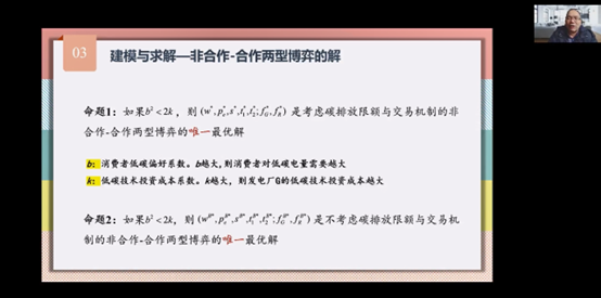 在本次学术讲座中,李登峰首先提出了碳排放限额背景下,一个电力发电厂和一个电力零售商组成的电力供应链的问题模型,然后介绍了发电厂电力批发价格与电力零售商销售价格的竞争、电力发电厂低碳技术投资水平与电力零售商低碳技术投资成本分摊、利润分享的合作及竞争行为。接下来,着重介绍了考虑碳排放限额与交易机制的非合作-合作两型博弈模型的建立与求解过程。最后基于所提出的博弈模型,探讨了碳排放限额与交易机制下电力供应链的价值共创及碳减排策略的优化路径。