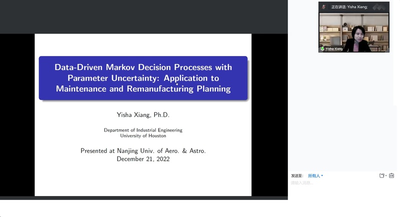 12月21日上午,休斯敦大学向一莎副教授受学院灰色系统研究所邀请,在腾讯会议作题为“数据驱动的带有参数不确定性的马尔科夫决策过程及其在运维和再制造计划中的应用”的学术讲座。永利官网教授刘思峰、谢乃明、米传民、副教授胡明礼、欧阳林寒、王俊杰等教师及部分硕、博研究生线上参加了向教授的报告分享,本次学术报告由谢乃明主持。