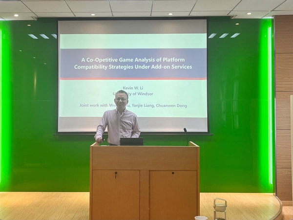 5月12日下午,加拿大温莎大学Odette商学院李武(Kevin W. Li)教授受学院智能决策与风险分析研究所邀请,在南航将军路校区304am永利集团官网702会议室作题为“A Co-Opetitive Game Analysis of Platform Compatibility Strategies Under Add-on Services”的讲座。永利官网教授徐海燕、教授陈克兵、副教授何沙玮、副教授王敏等教师及部分硕、博研究生现场聆听了李武教授的报告分享,本次学术报告由徐海燕教授主持。
