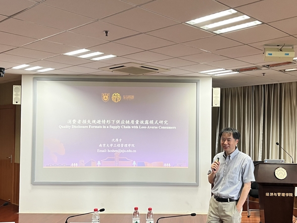 南京大学沈厚才教授作题为“Quality Disclosure Formats in a Supply Chain with Loss-Averse Consumers”的学术报告,沈教授首先提出了不同类型消费者情形下质量披露模式选择问题,接着从博弈顺序和消费者效用函数的角度建立模型,并从消费者质量偏好同质、消费者质量偏好异质、消费者损失规避异质和不同消费者类型下比较等角度分析模型计算结果,最后得出质量披露模式选择、质量披露策略、消费者的损失规避程度影响三个方面的结论。