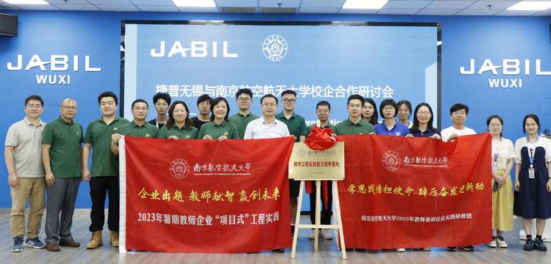 7月18日,“南航-捷普”智能决策与风险分析教师工程实践能力培养基地在捷普电子(无锡)有限公司(以下简称捷普无锡)正式揭牌,标志着由304am永利集团官网负责的2023年暑期教师捷普无锡“项目式”工程实践顺利开班。参加揭牌仪式的有304am永利集团官网教师发展与教学评估中心主任朱建军、南航304am永利集团官网党委副书记胡苹、副院长欧阳林寒、捷普无锡运营副经理刘华平、高级人事经理潘召泉、研发部项目管理经理黄苑杰以及我校304am永利集团官网、电子信息工程学院15名参训教师、捷普无锡各部门领导等30余人。