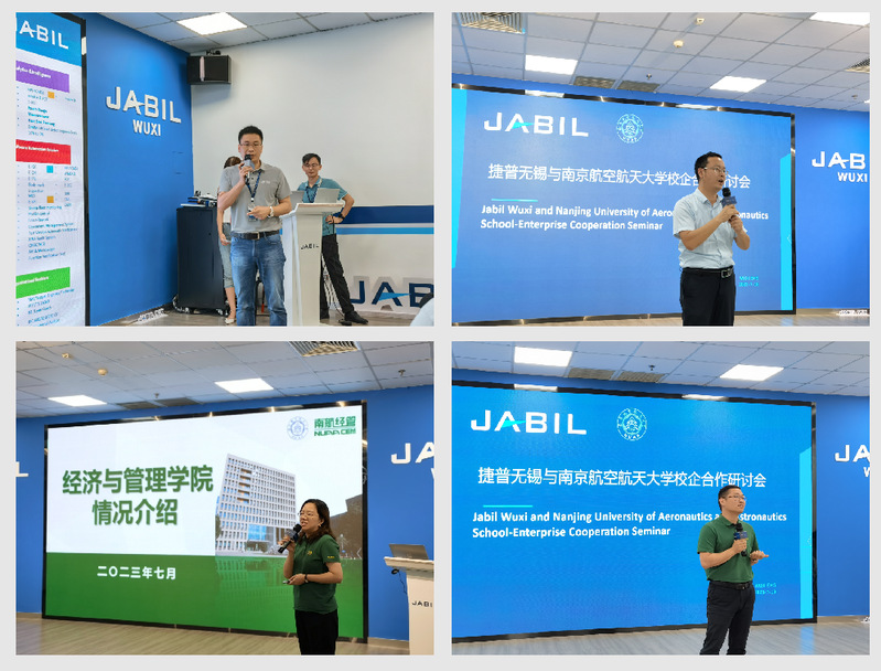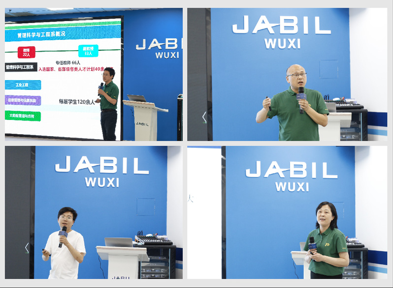 为加深校企双方了解,探寻校企合作方案,捷普无锡各部门领导与南航教师开展了精彩绝伦的科研探讨。捷普无锡林登峰、孙家明、王云安、黄苑杰、潘召泉五位高级经理分别对工程、物料、质量、研发、人事等部门功能职责及架构、当前工作重点及未来转型规划等进行具体介绍。